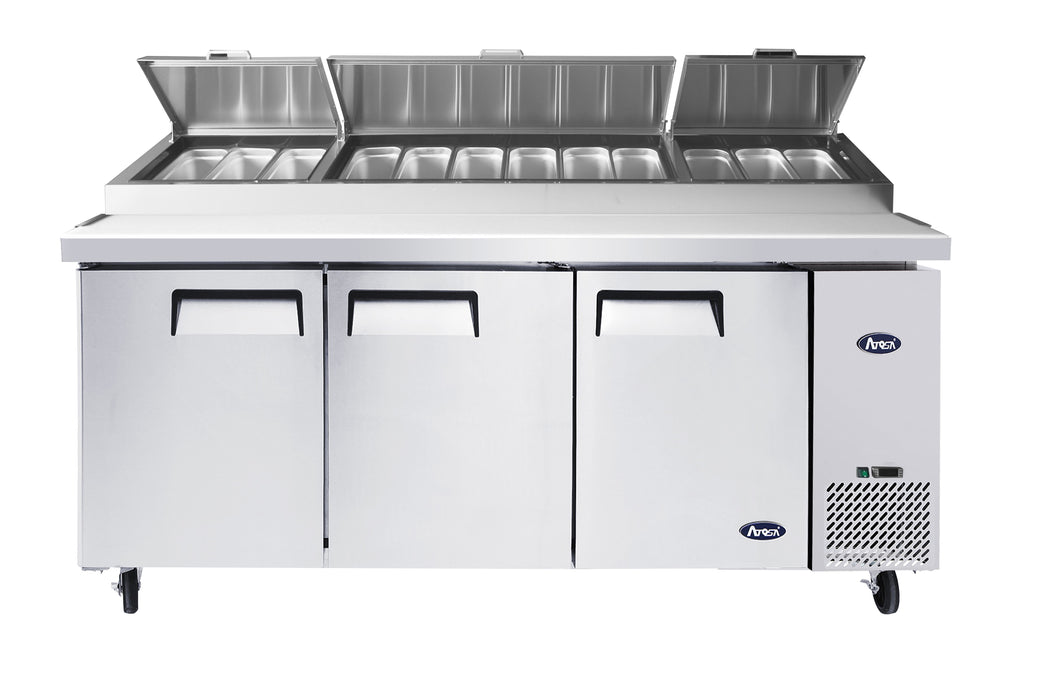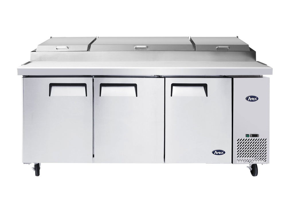 Atosa MPF8203, 93-Inch 3-Door Pizza Prep Table, is a commercial equipment unit, designed for productive pizza preparation purposes. The unit holds (12) 1/3-size pans to keep all your fresh toppings close at hand. Its 2/3 HP compressor aimed to give great efficiency at minimum energy consumption and keeps the products at a safe holding temperature. Inside temperature ranges from 33 to 38F, while reliability is ensured by the defrost timer system, which prevents icing. The preinstalled shelves (with 155 LBS loading capacity per shelf) and castors allow you to locate the shelves just where you need them to accommodate your small or large food products.