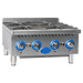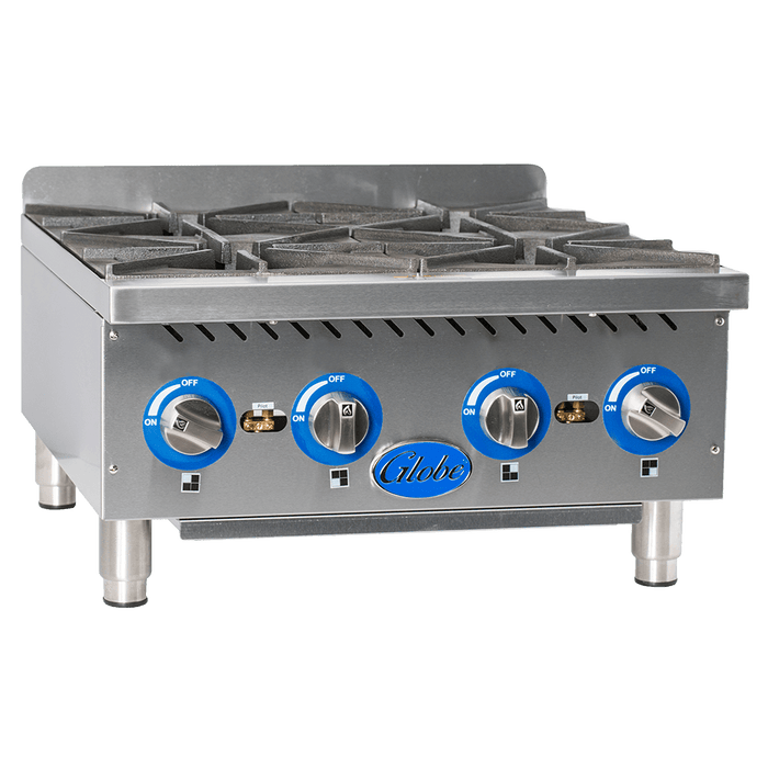 Available in 6 models, Globe’s countertop hot plates come with reversible heavy-duty, cast iron grates, accommodating every-day pots and pans on one side or woks on the other. Standard hot plates deliver 22,000 BTUs per burner and Step-Up hot plates have 30,000 BTUs. Both types are available in 2, 4 and 6-burner models.