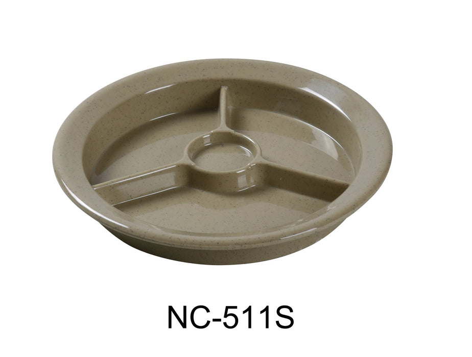 The Yanco NC-511S Melamine Compartment Plate is an extra-heavy-duty and durable plate designed for schools, nursing homes, hospitals, and airlines. This 9" round plate has a 3-compartment design with a cup holder. It is made from high-quality melamine, is break-resistant, and looks and feels like porcelain. It is also lightweight, stackable, and dishwasher-safe.